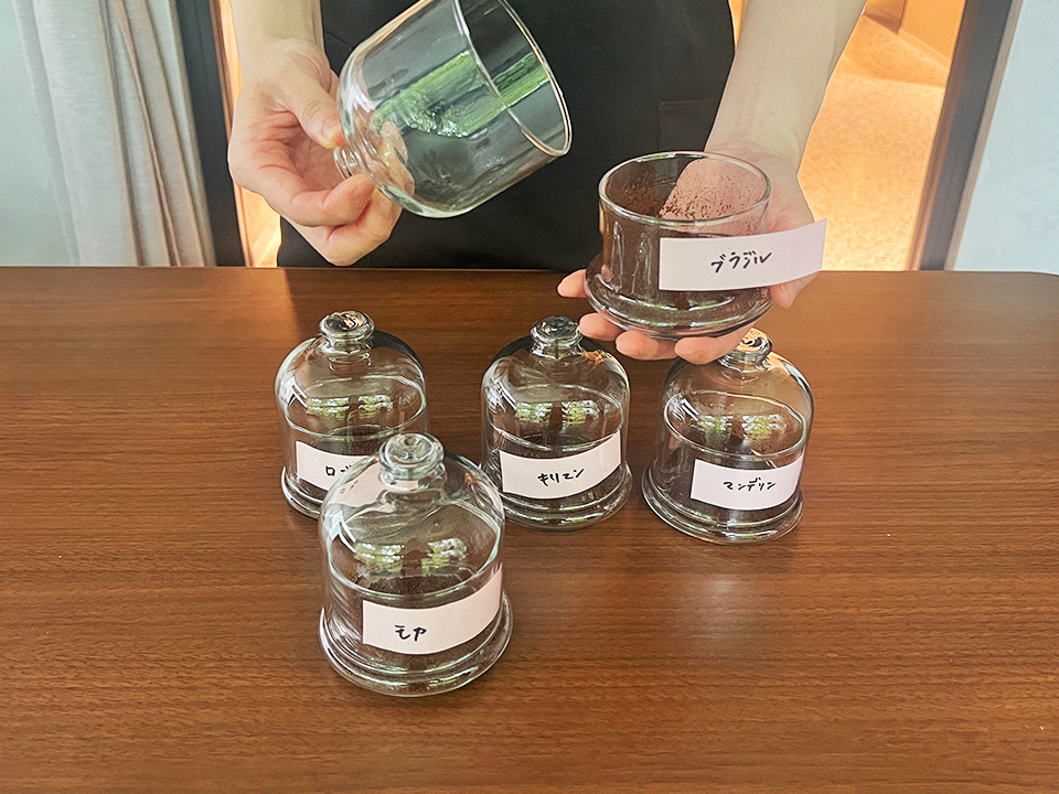 たしかにコーヒー豆を挽くと、部屋に香りが広がって幸せになりますね。そして「ブラジル」「モカ」「マンデリン」などいくつか並べてフレグランスを比較してみると、個性の違いがよりはっきりわかります。