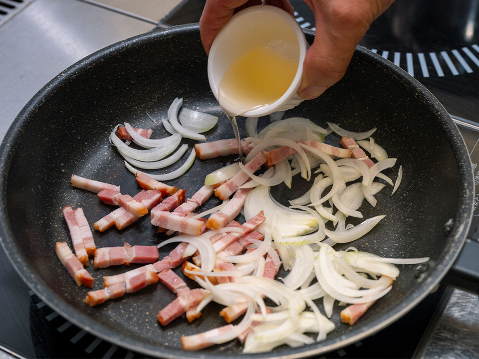 - 焼いている間に具材の下ごしらえを。玉ねぎは薄切り、ベーコンは短冊切り、ジャガイモはいちょう切りにしてボイル、ほうれん草は3〜4cmにカットする。