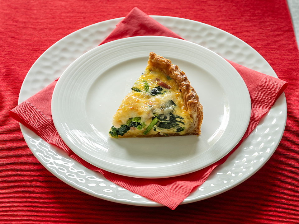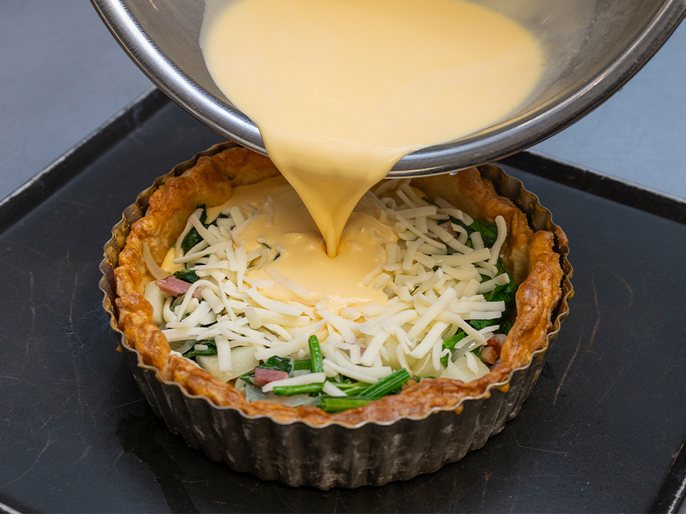 卵液に具材を混ぜてから流し込む方法もありますが、具材を先にパイにのせてから卵液を注ぐと、断面も美しく、見た目がきれいに仕上がるコツだそう。