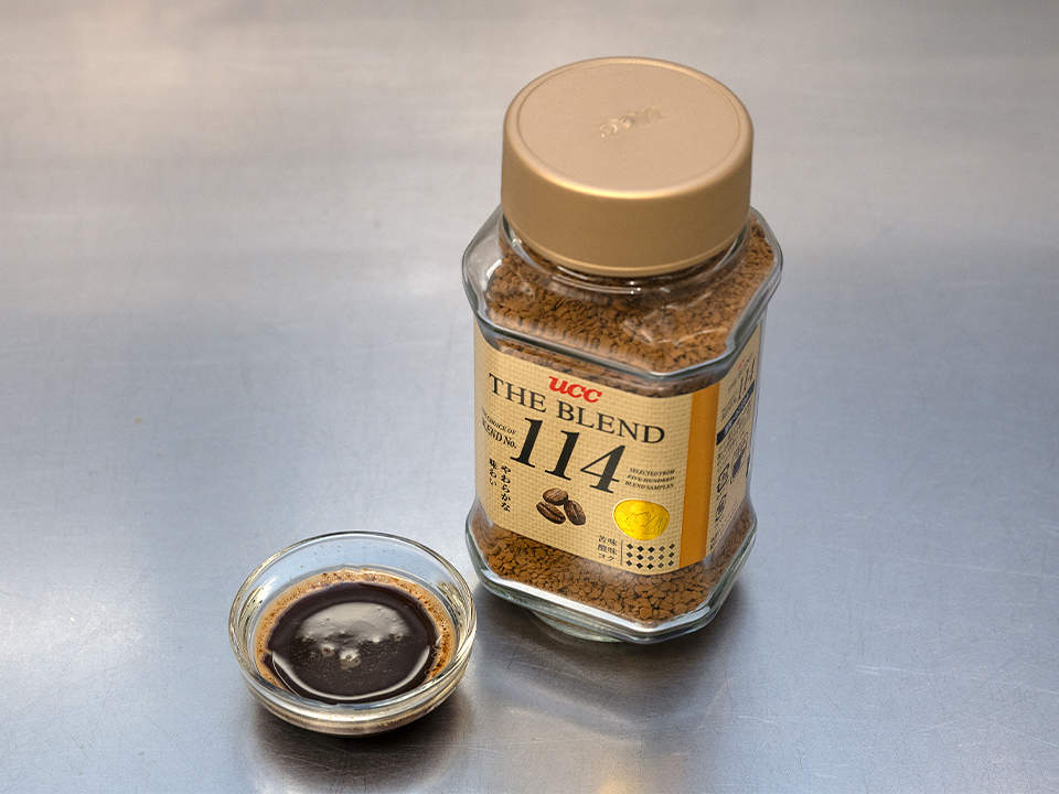 今回使用したインスタントコーヒーは、『ザ・ブレンド 114』。料理のために豆を挽いて濃いめに淹れるのはちょっと手間ですが、お湯にさっと溶かすだけなら、調味料感覚で気軽に取り入れられますね!