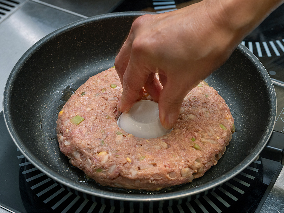 - フライパンに油を引き、肉ダネを平たい円形に広げます。