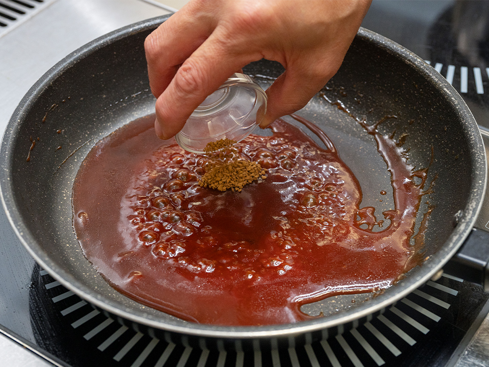 ソースにも、インスタントコーヒーをひとさじ忍ばせます。ここではお湯に溶かさず、そのまま加えてOK。煮詰めていくうちに、ふわっと立ちのぼるコーヒーの香りがなんとも心地よく、仕上がりが楽しみ!