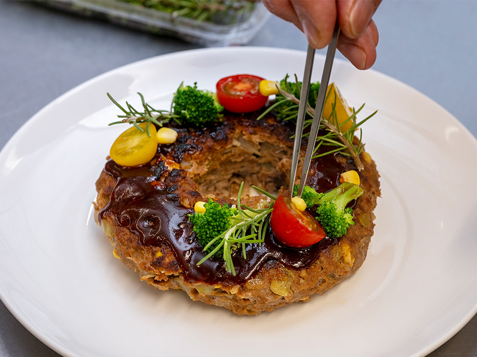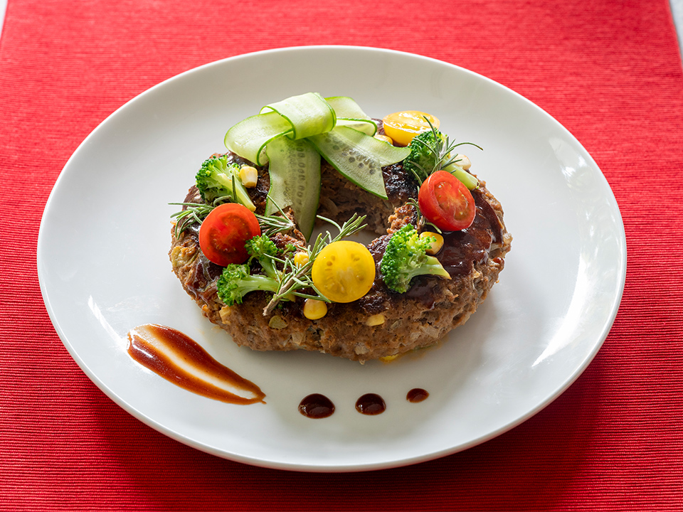 続いてご紹介するのは、リース型が可愛いミートローフ。見た目は華やかですが、実は材料を混ぜて焼くだけの手軽さが魅力です。さらに今回は、お肉にもソースにもインスタントコーヒーをプラスして、いつもの味に深みを加えてみました。