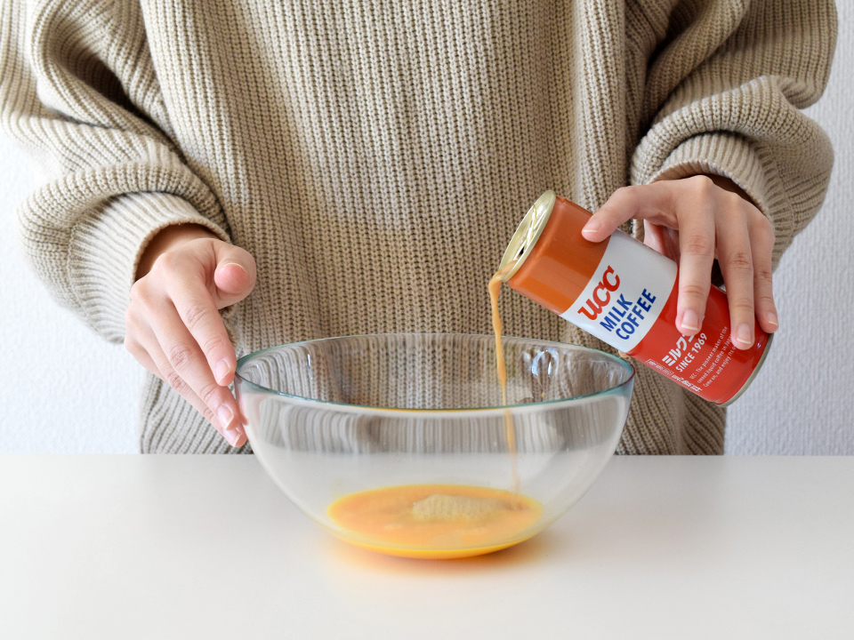 - ボウルに卵を割り入れ、白身をしっかり切るように混ぜる。そこにUCC ミルクコーヒー缶も加えて、軽く混ぜる。