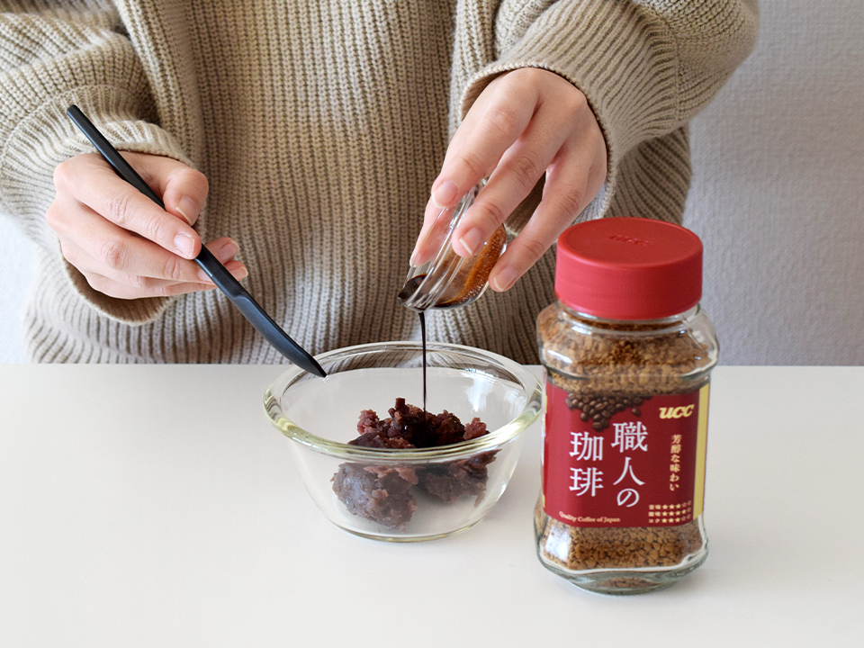 使うのは、ココア風味のパンとインスタントコーヒー「UCC 職人の珈琲」。あんことバター、コーヒー、そしてチョコの香りがとけ合い、和と洋が絶妙にマリアージュした一品です。