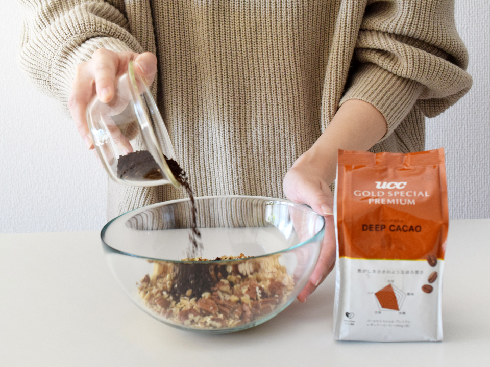 コーヒー豆は、かなり粗めに挽くのがおすすめ。カリッとした食感がアクセントになり、噛むほどにコーヒーの香ばしさと風味が口いっぱいに広がります。