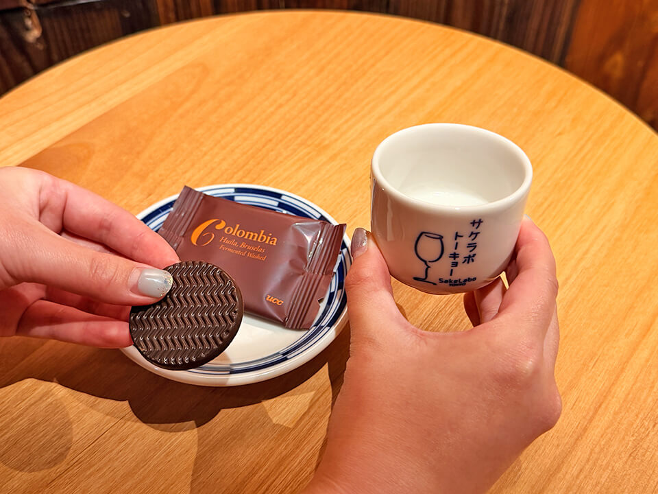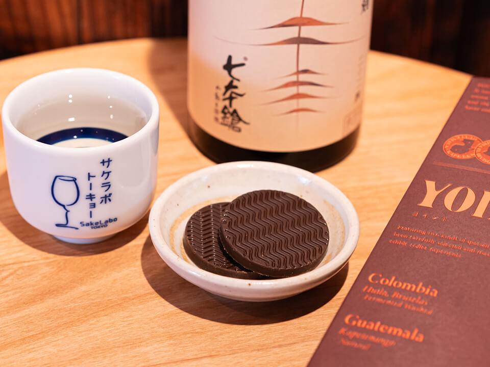 次に、『YOINED』を少量(目安としてはひとかけの6分の1ほど)口に含みます。口の中がコーヒーの風味で満たされ、「香りのピークにきた」と感じたタイミングで、日本酒を一口。すると、コーヒーと日本酒が重なり合い、互いの良さが引き出されていく感覚を味わえます。